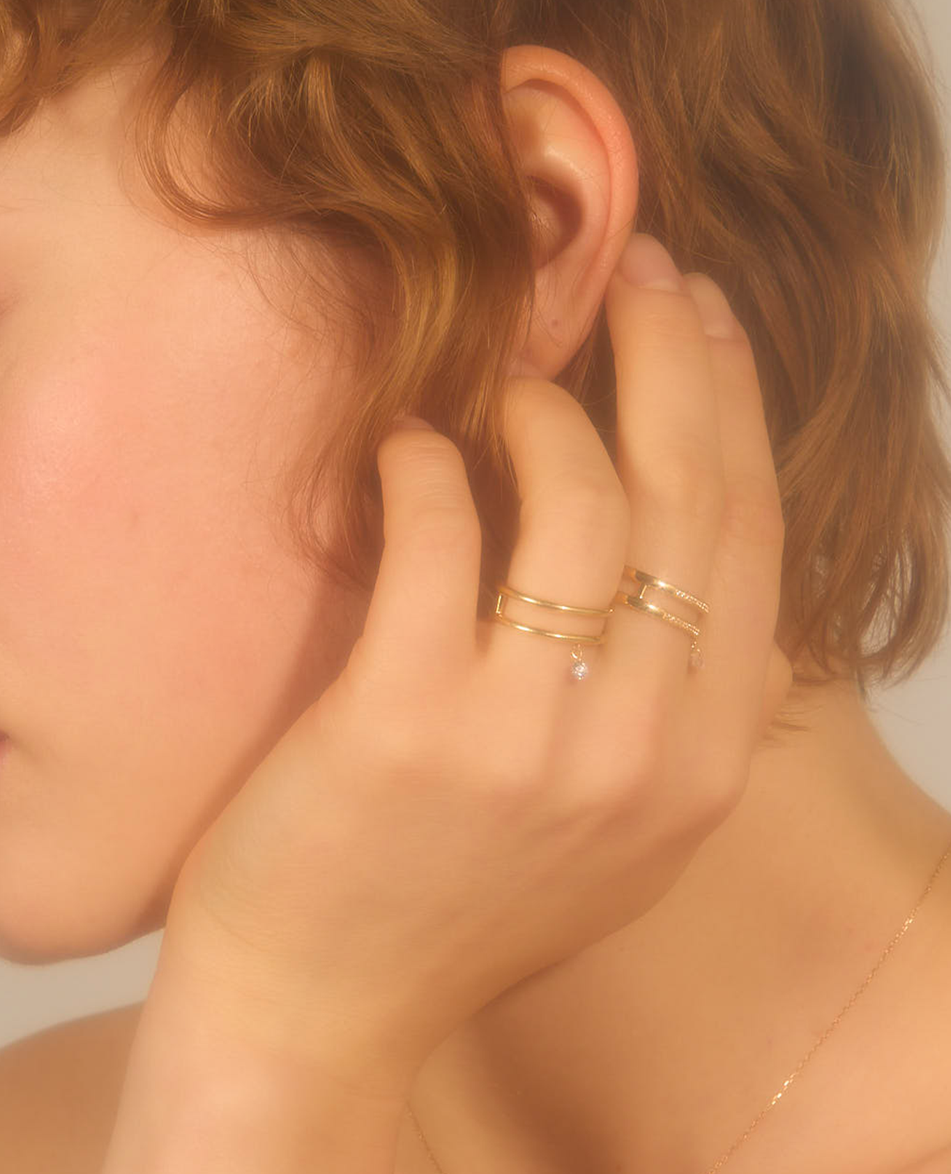 Zeus double ring in 18-carat yellow gold and suspended pierced diamond