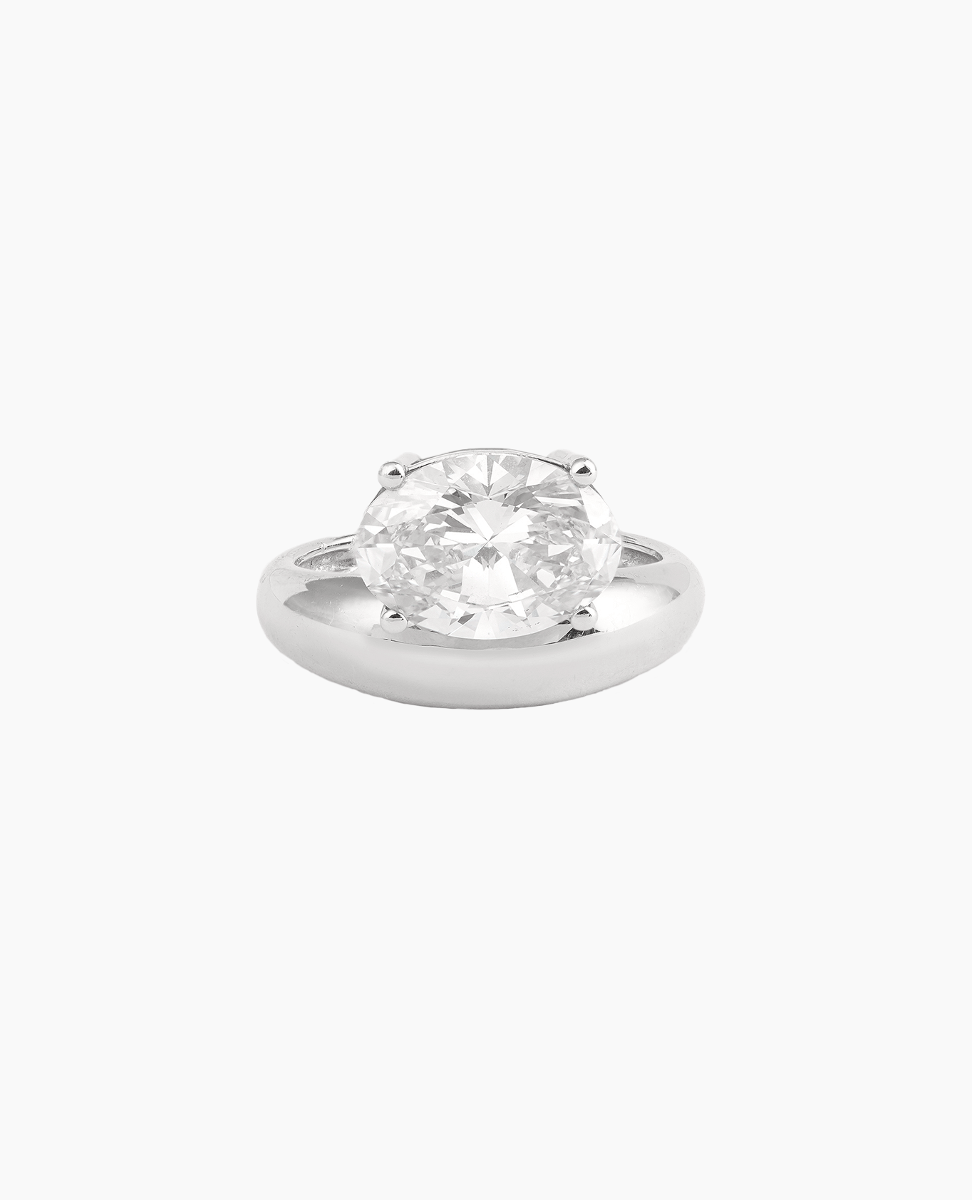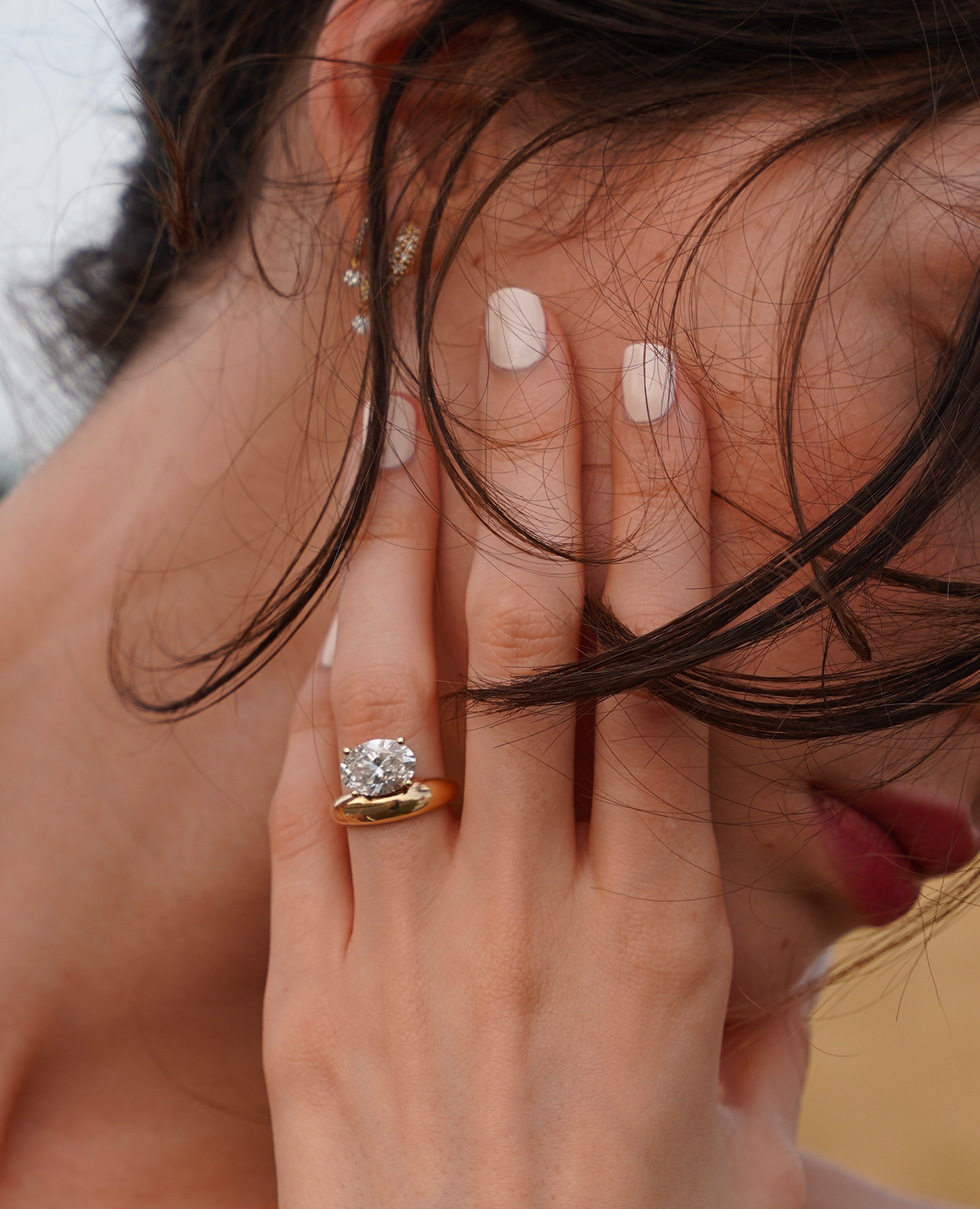 Montée sur une base lisse et généreuse, cette pièce joue sur les volumes et les contrastes : un diamant d’exception en lévitation, porté par une monture aux lignes modernes et audacieuses.