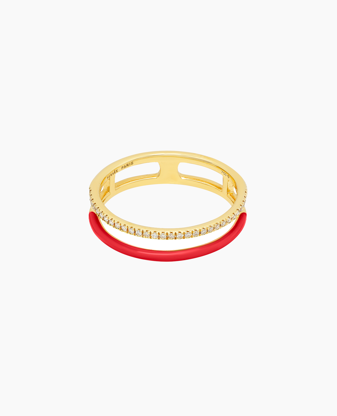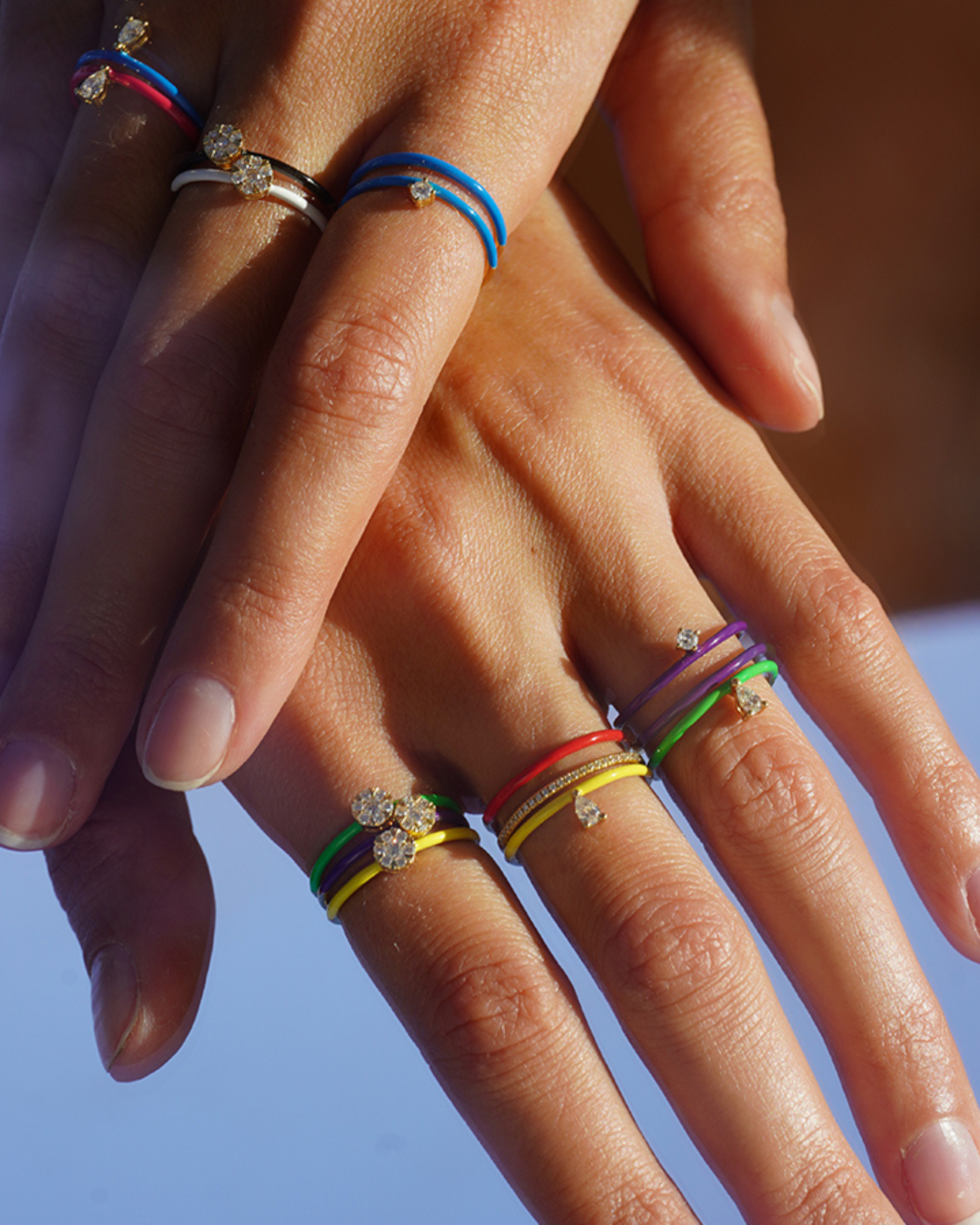 Semblable à une laque précieuse, huit teintes d’émail aux couleurs néons se posent sur des bijoux singuliers et modernes.