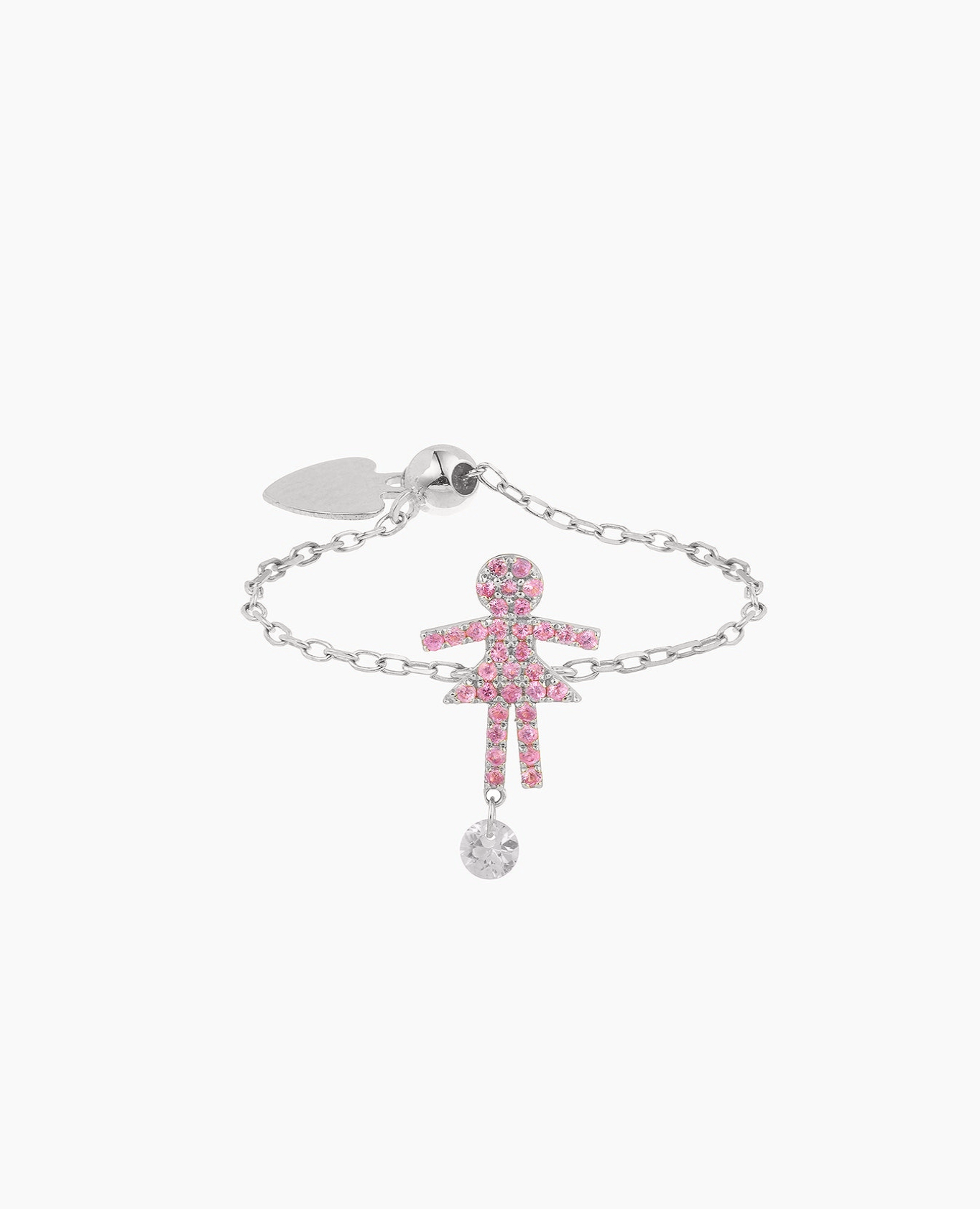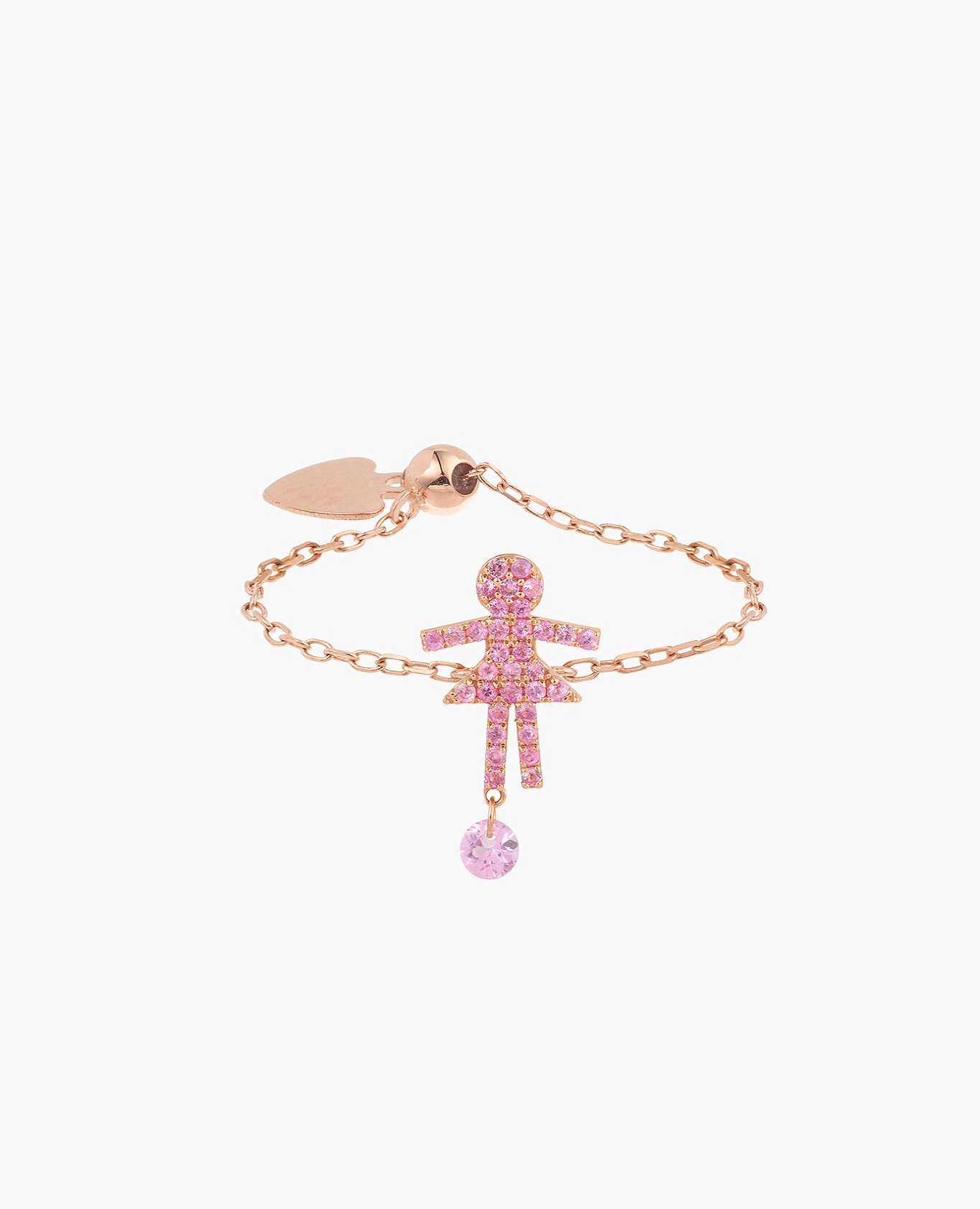 Bague chaînette Girl pavée de saphirs rose et d'un saphir rose percé suspendu.