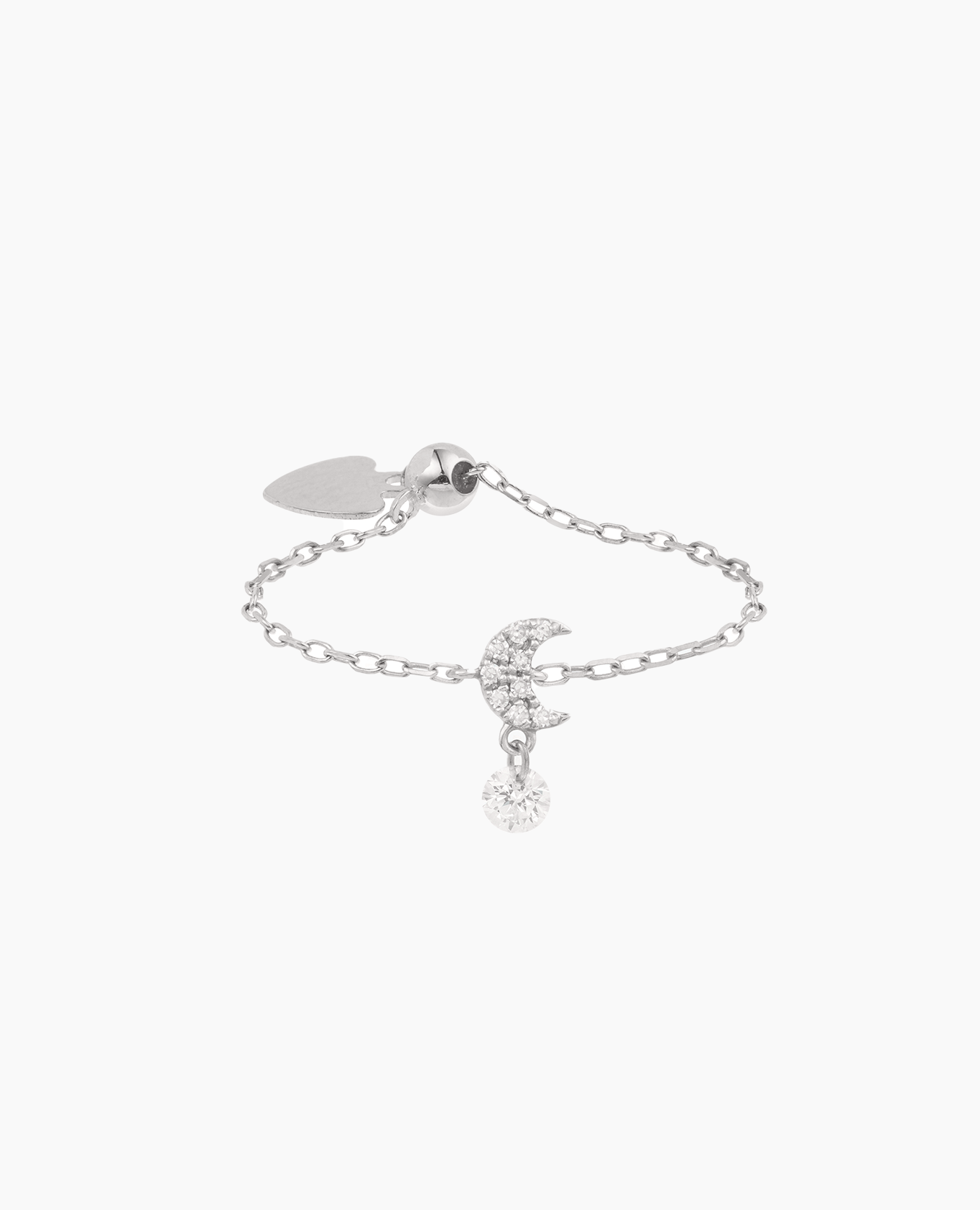 Persée Paris présente sa bague chaînette mini lune, issue de la collection Séléné, hommage à la déesse de la Lune.