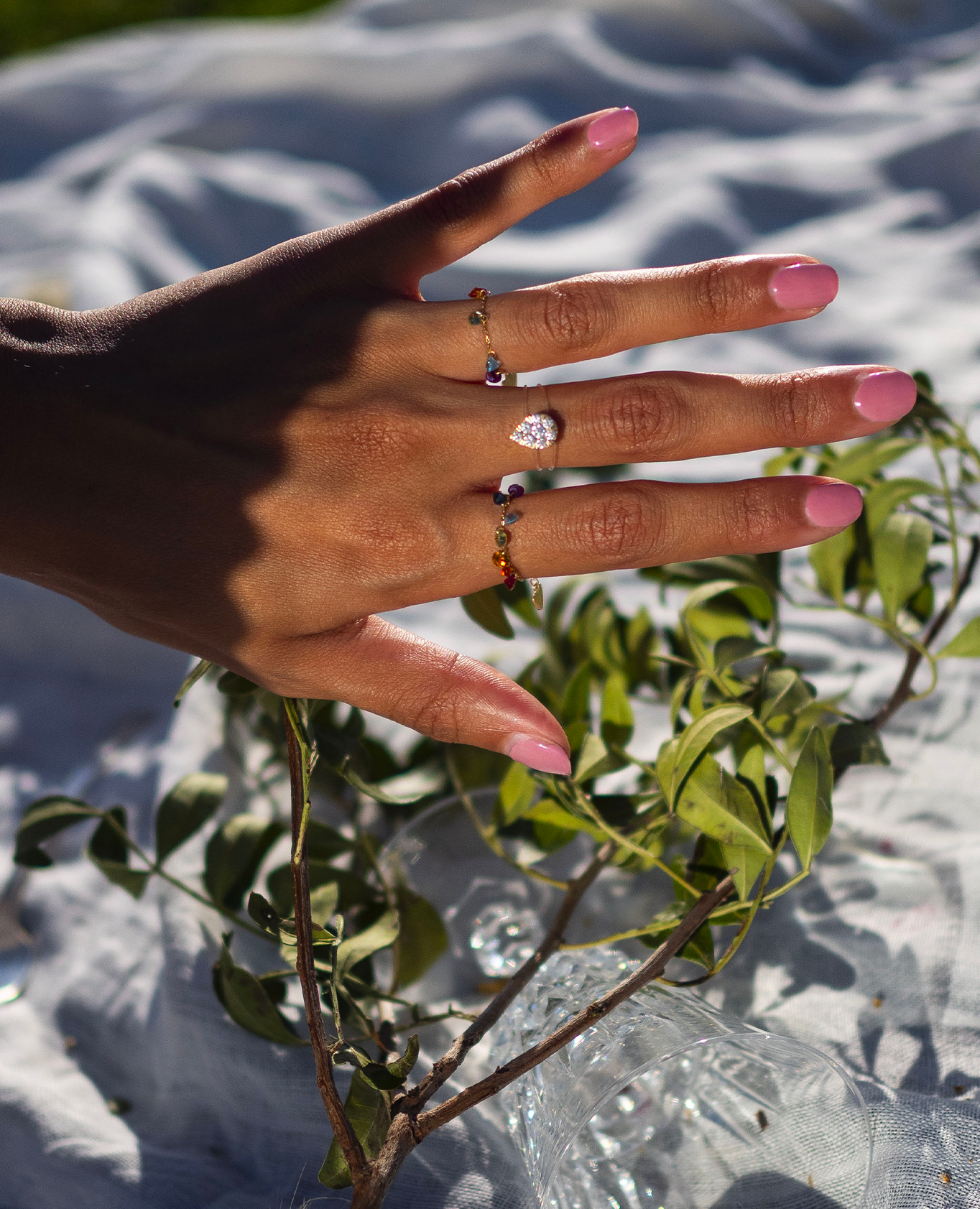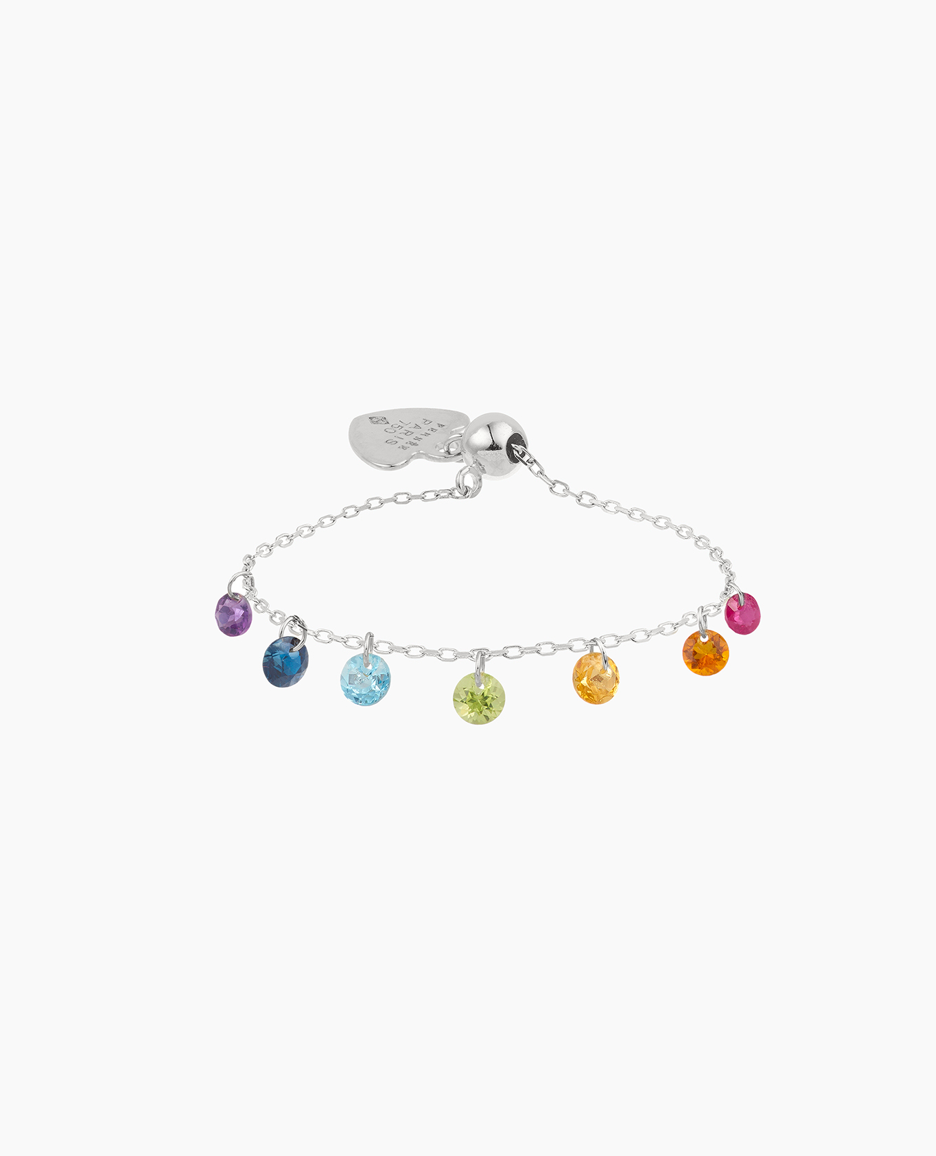 Persée Paris présente sa bague ajustable 7 Chakras, parée de 7 pierres précieuses. Les 7 nuances se rencontrent et s'assemblent sur une fine chaînette, pour former une harmonie de couleurs unique et inspirante.