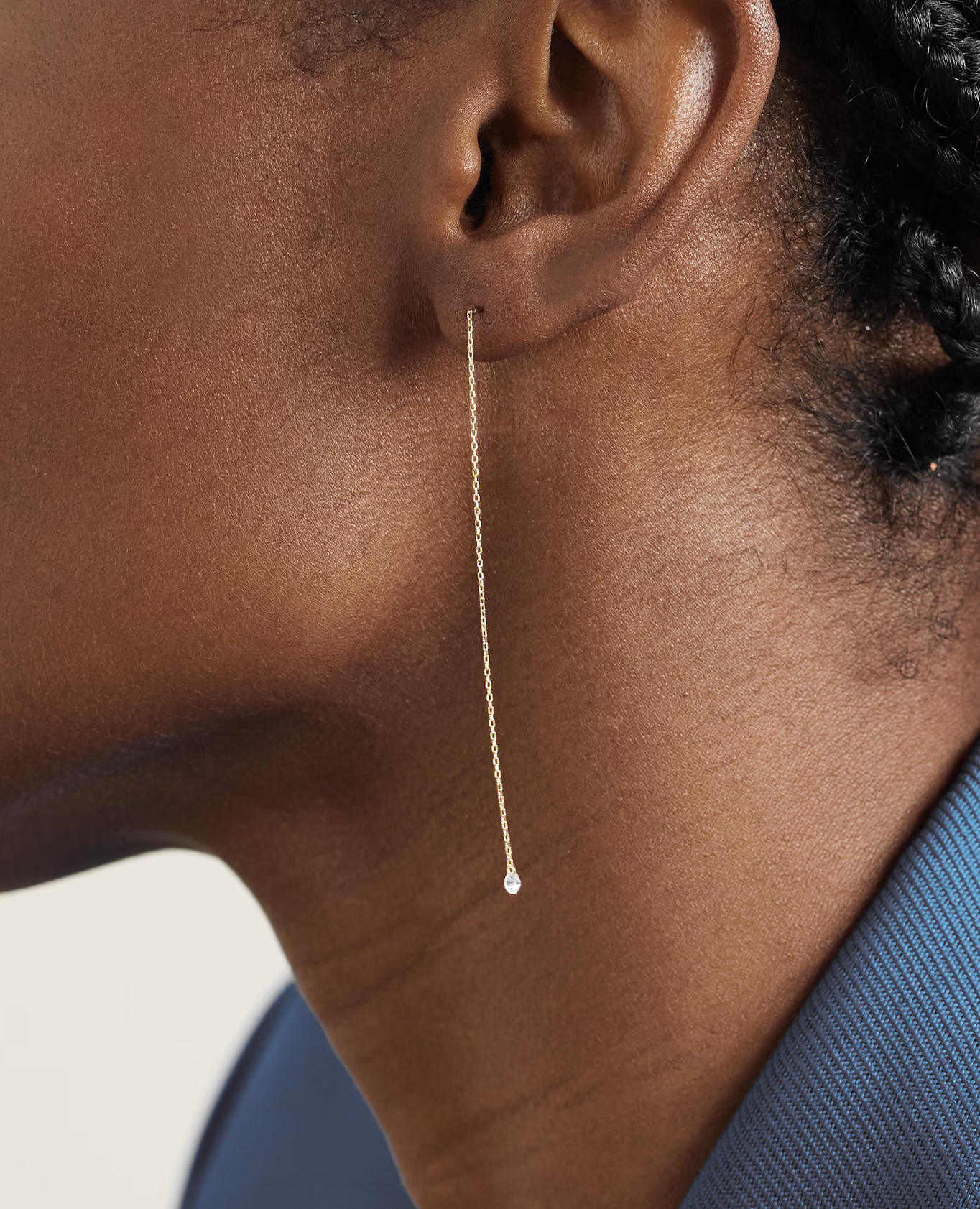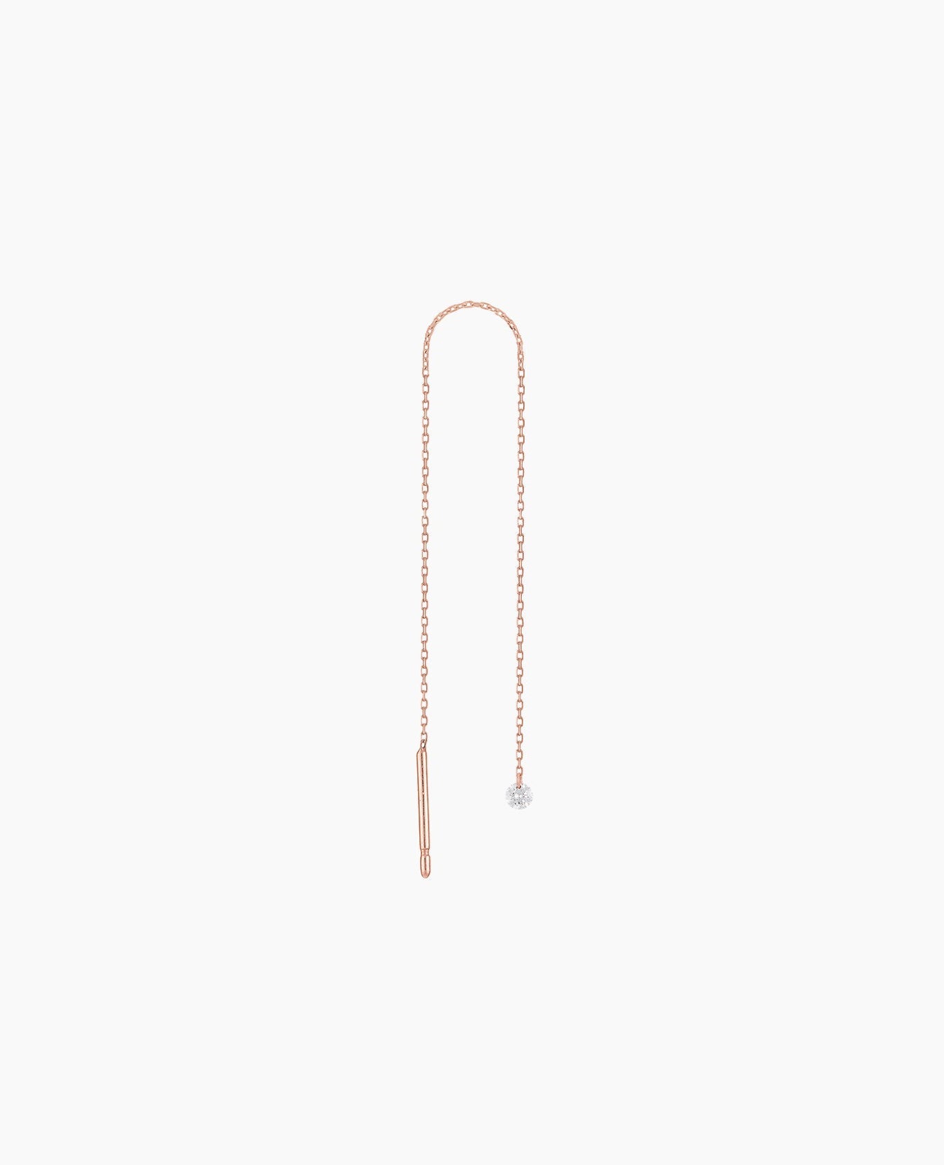 Découvrez cette boucle d’oreille Danaé, une pièce unique alliant modernité et délicatesse. Sa fine chaîne en or 18 carats 750/1000 glisse élégamment autour du lobe, tandis qu’un diamant naturel percé suspendu apporte une touche précieuse et intemporelle à ce bijou minimaliste.