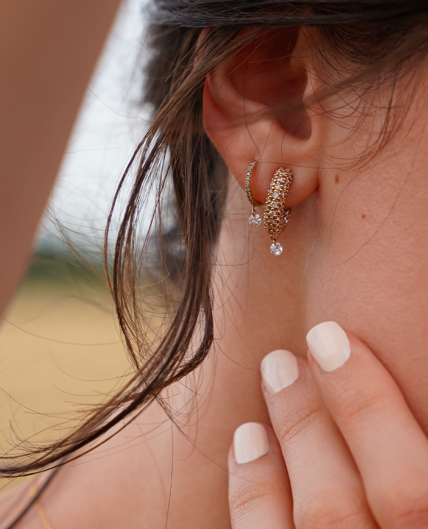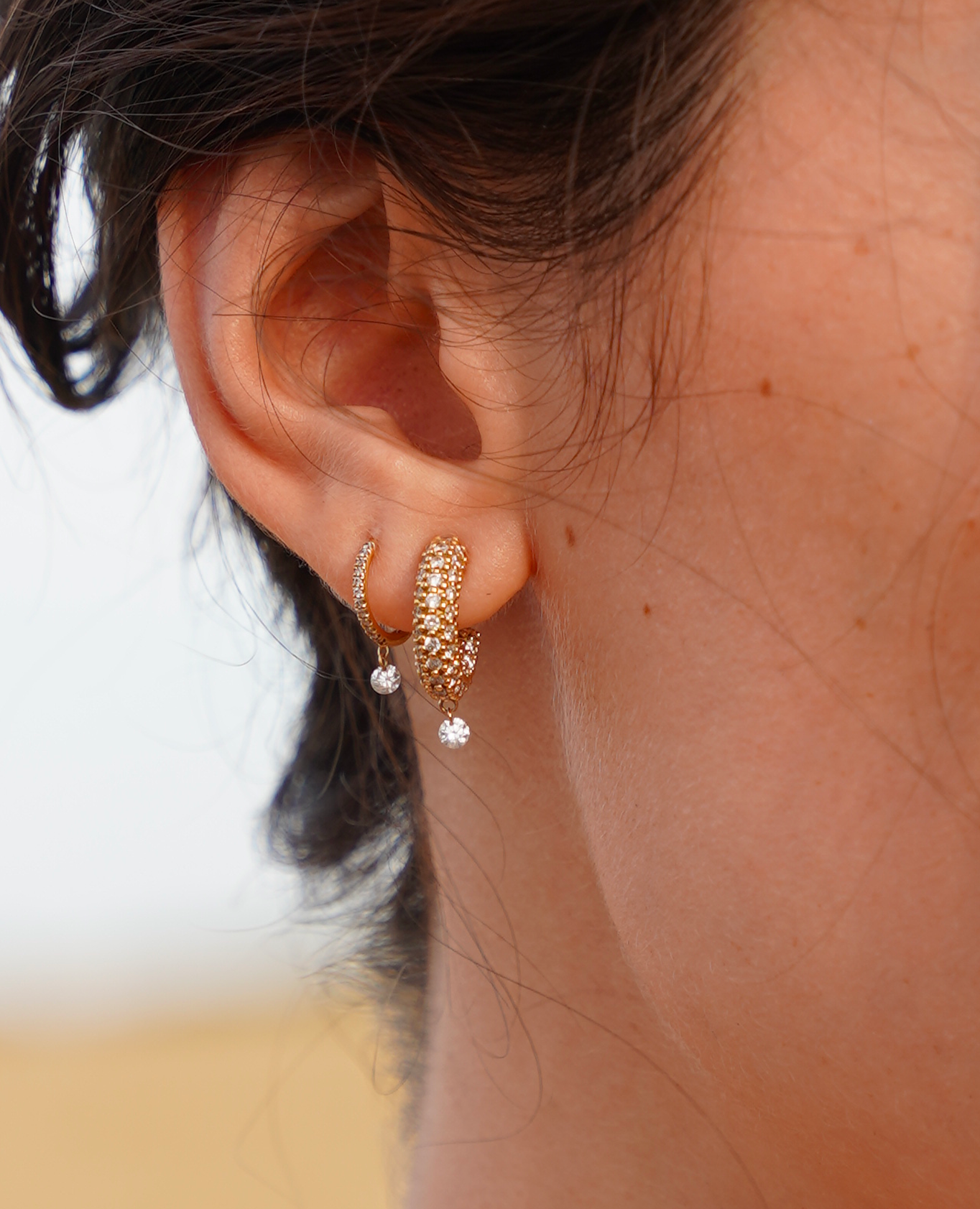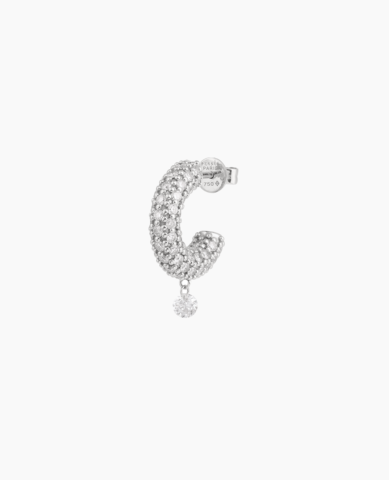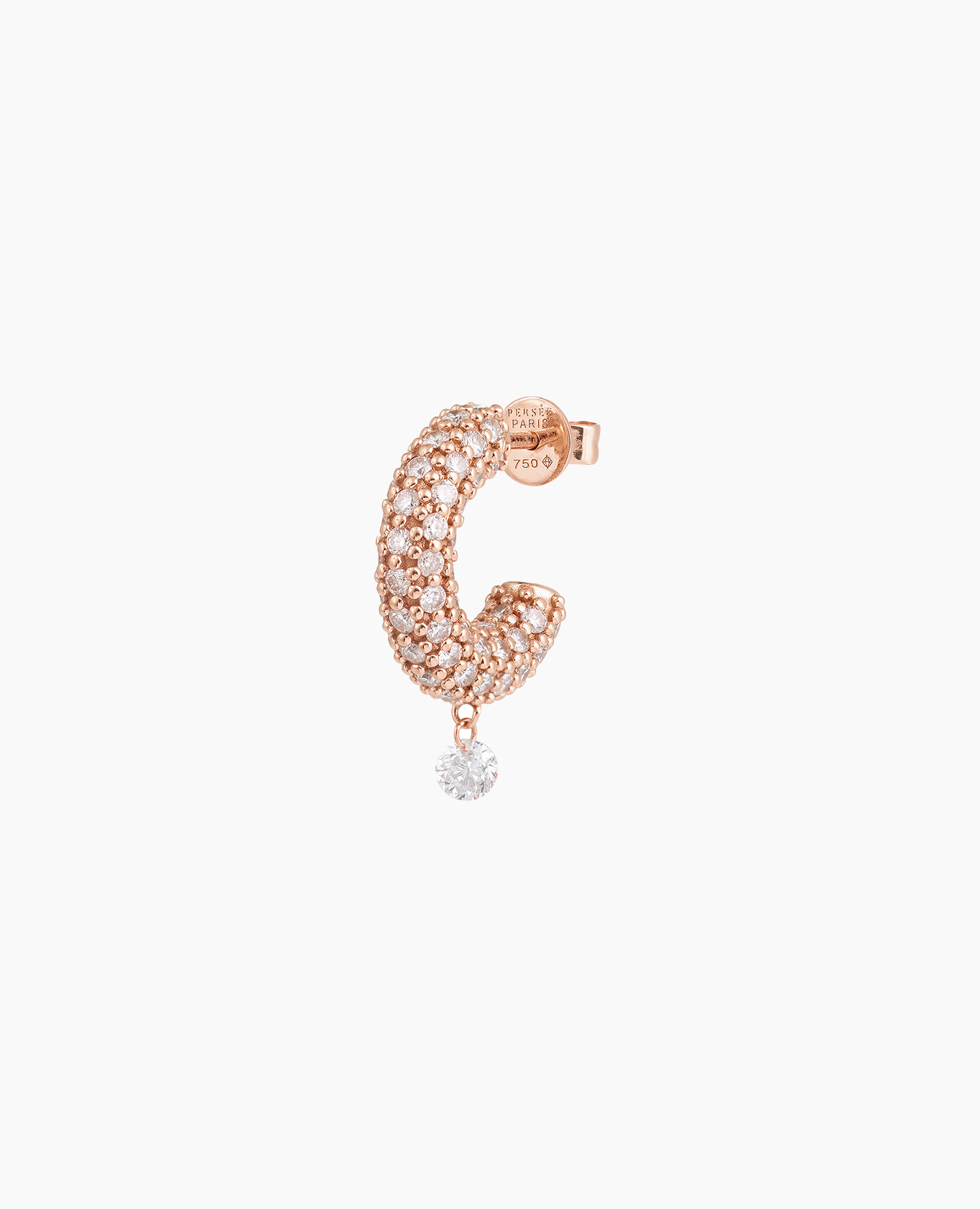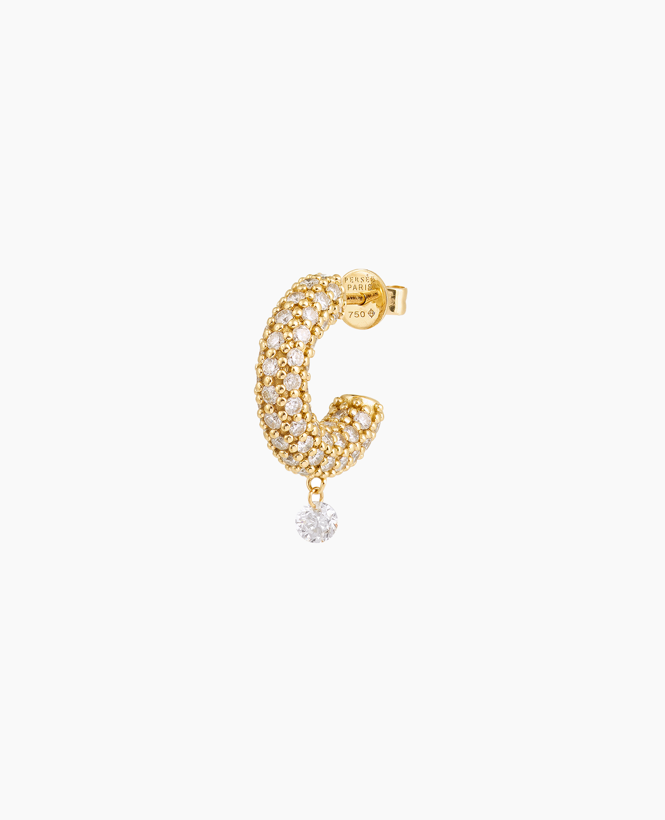 Créole en or 18 carats, pavée de diamants et sublimée par un diamant suspendu. Vendue à l’unité.