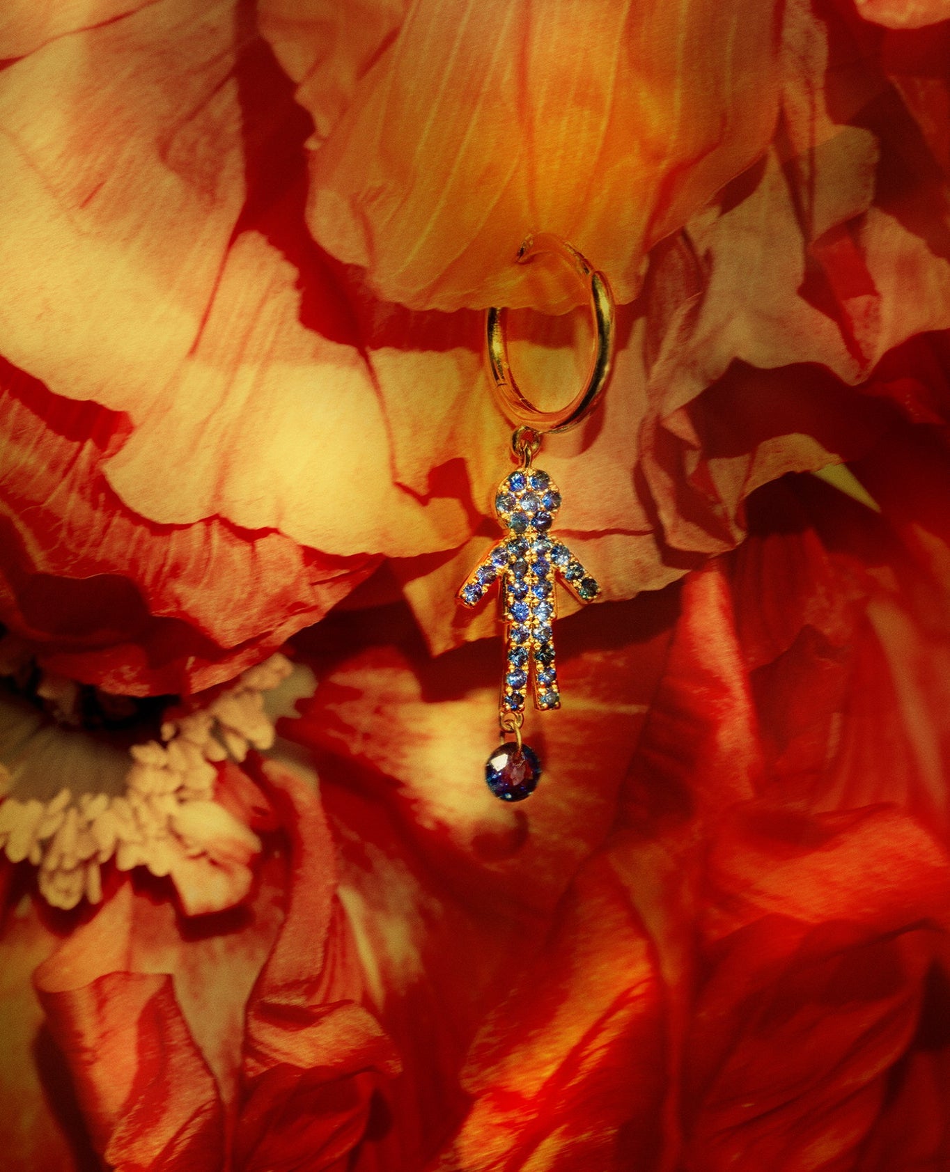 Boucle d'oreille anneau symbole garçon pavée de saphirs en or 18 carats et ornée d'un saphir percé suspendu.