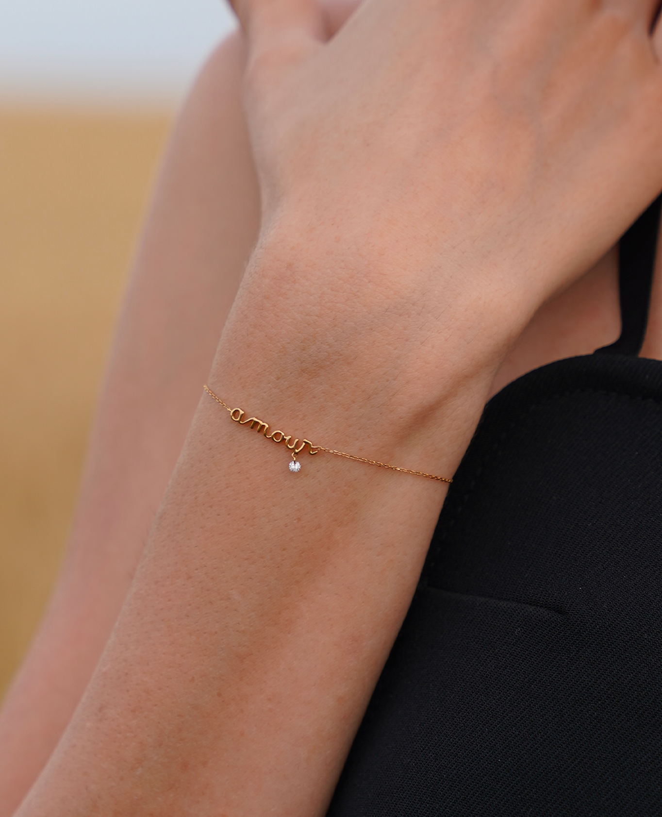 Bracelet Venus or 18 carats représentant le mot "amour" orné d'un Diamant suspendu.