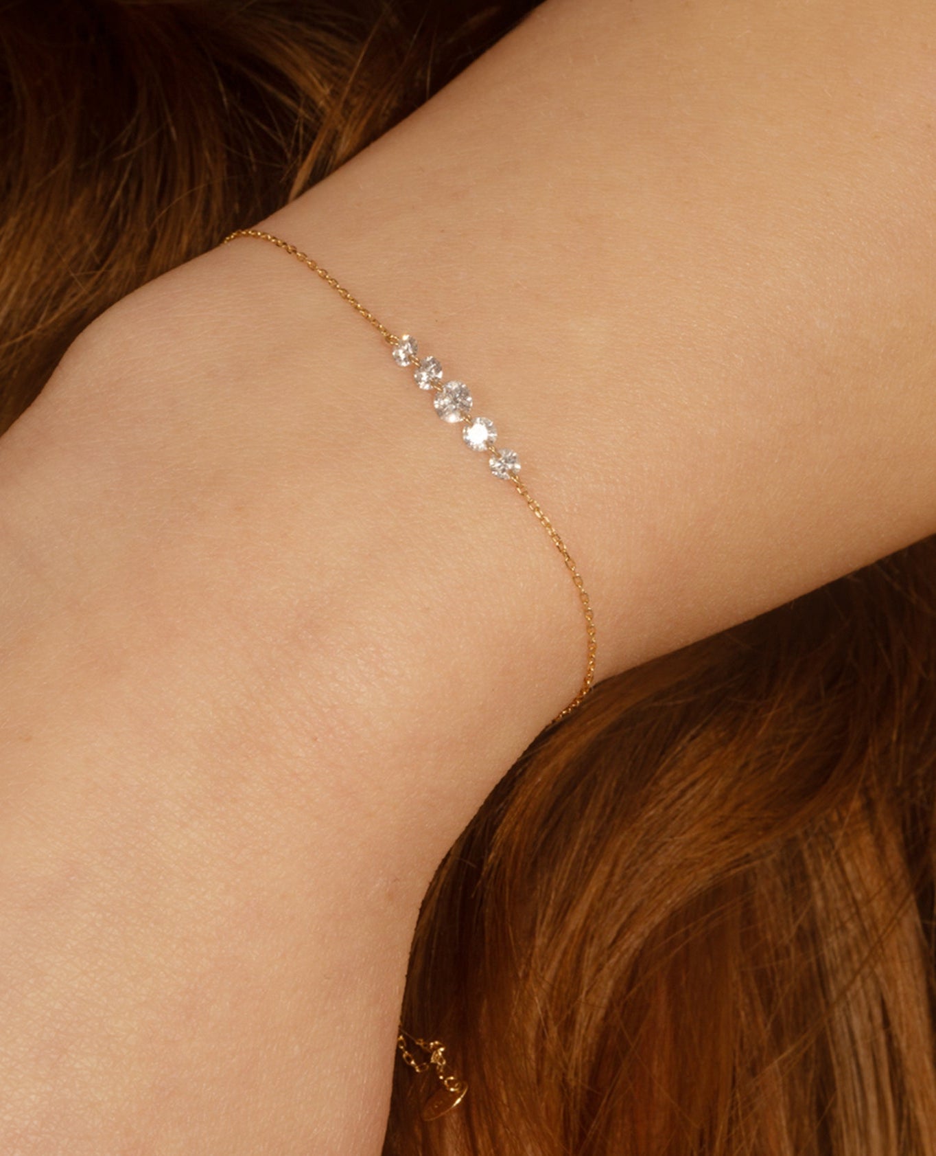 Au rythme de vos mouvements, les cinq diamants percés resserrés de ce bracelet en or diffusent sa lumière étincelante si particulière. Son design minimaliste se porte avec tout. Sa taille est réglable grâce à une bille en silicone.