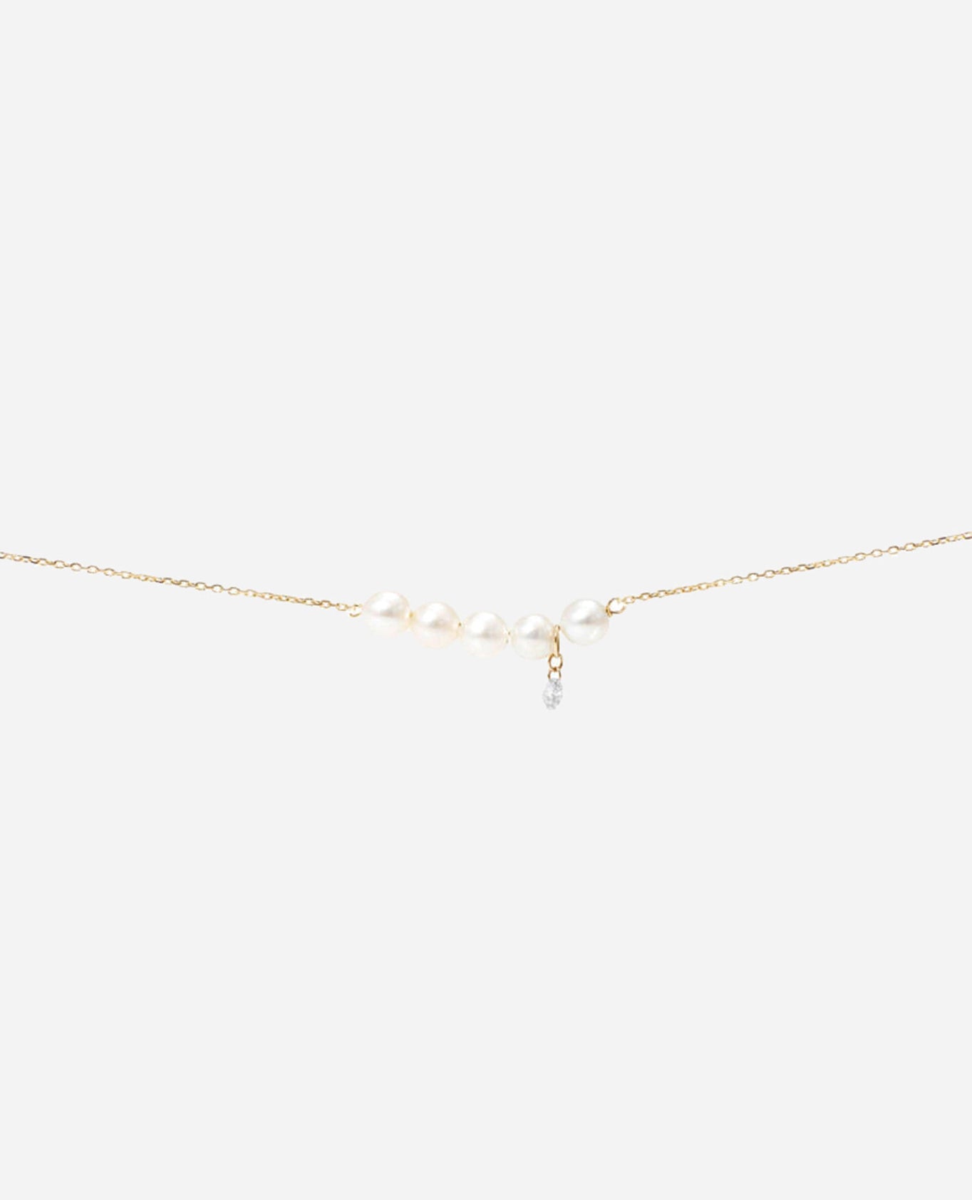 Un modèle classique et raffiné, qui convoque un incontournable de la joaillerie : la perle de culture. Il est ici mis en lumière avec un diamant percé suspendu, emblème de la marque.