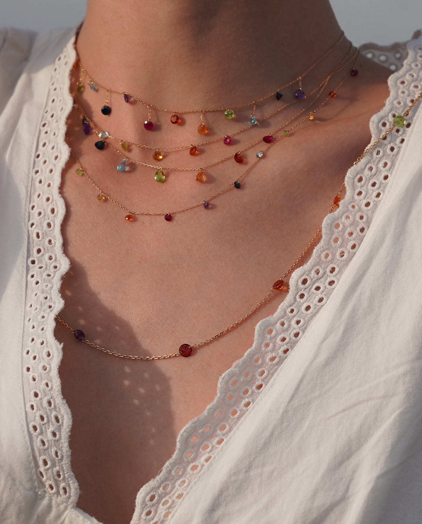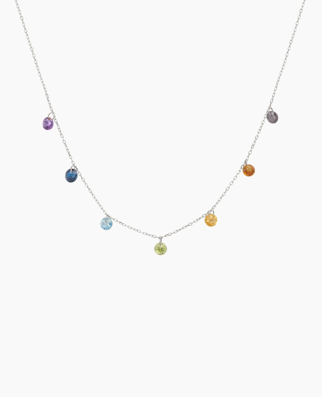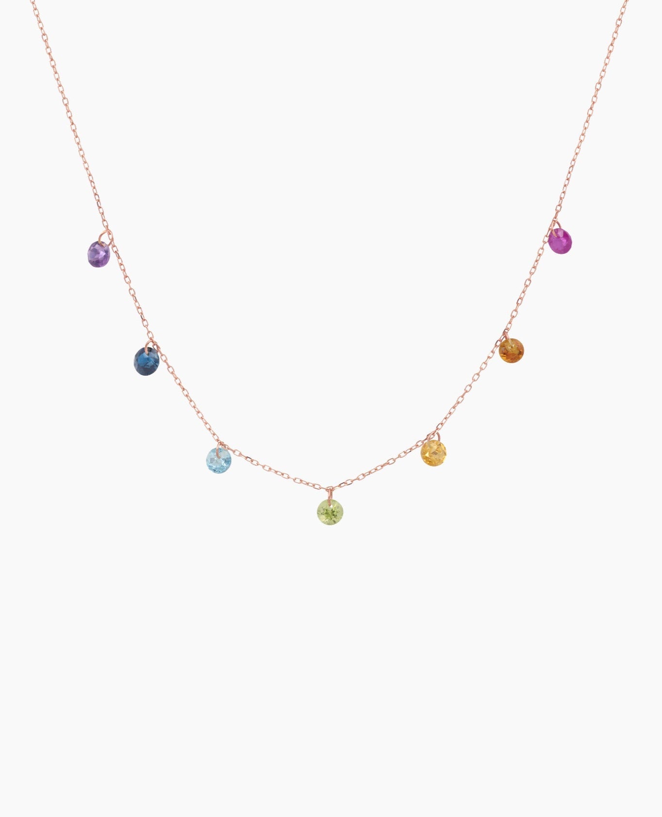 Collier Chakras or 18 carats et 7 pierres précieuses : Améthyste, Topaze, Rubis, Citrine, Péridot, Saphir et Citrine mandarine.