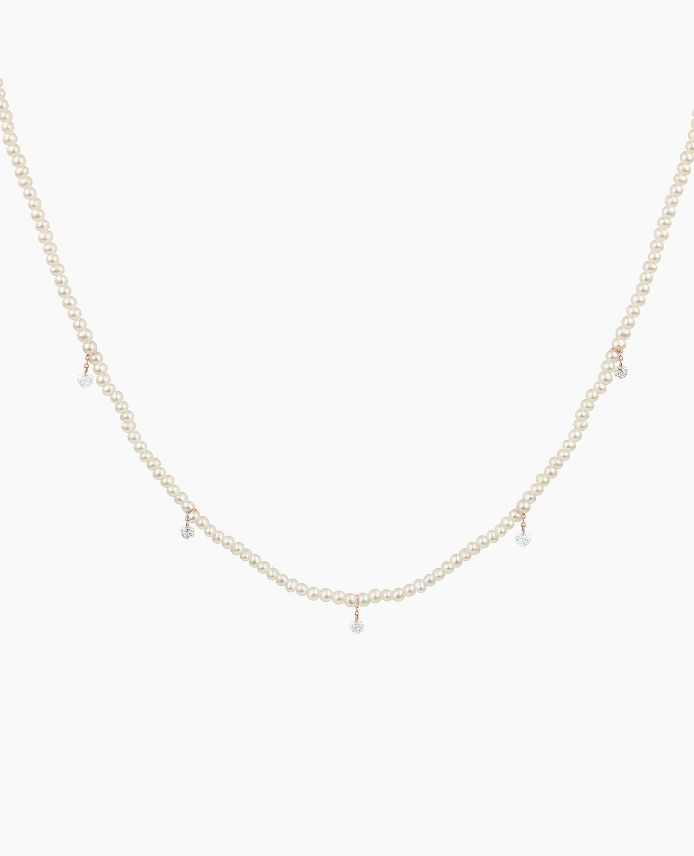 Un modèle classique et raffiné, qui convoque un incontournable de la joaillerie : la perle de culture. Il est ici mis en lumière avec un diamant percé suspendu, emblème de la marque.