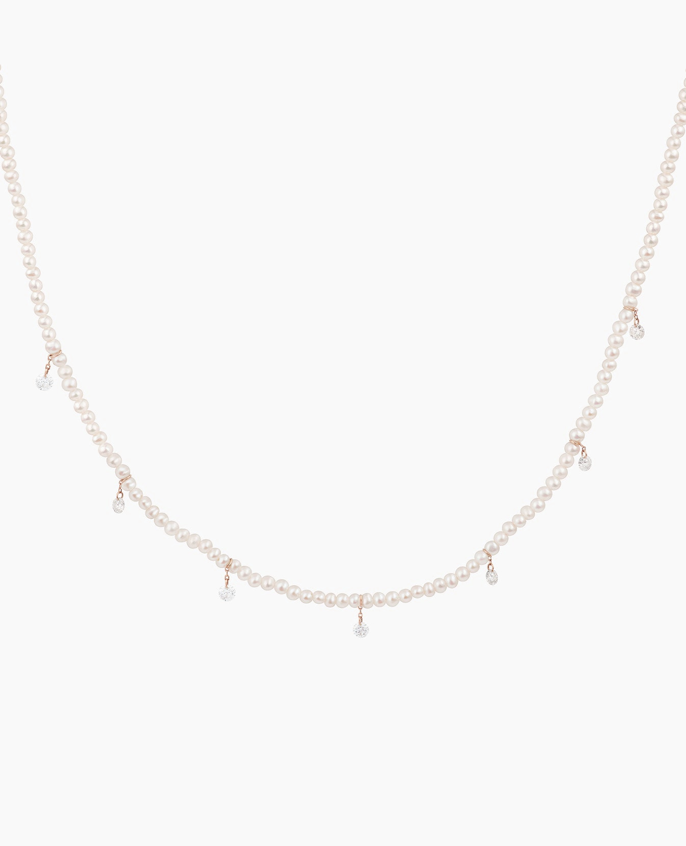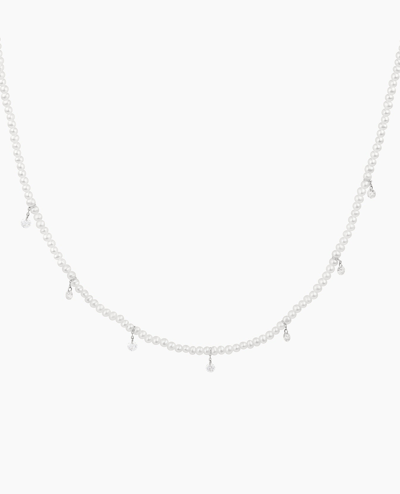 Un modèle classique et raffiné, qui convoque un incontournable de la joaillerie : la perle de culture. Il est ici mis en lumière avec un diamant percé suspendu, emblème de la marque.