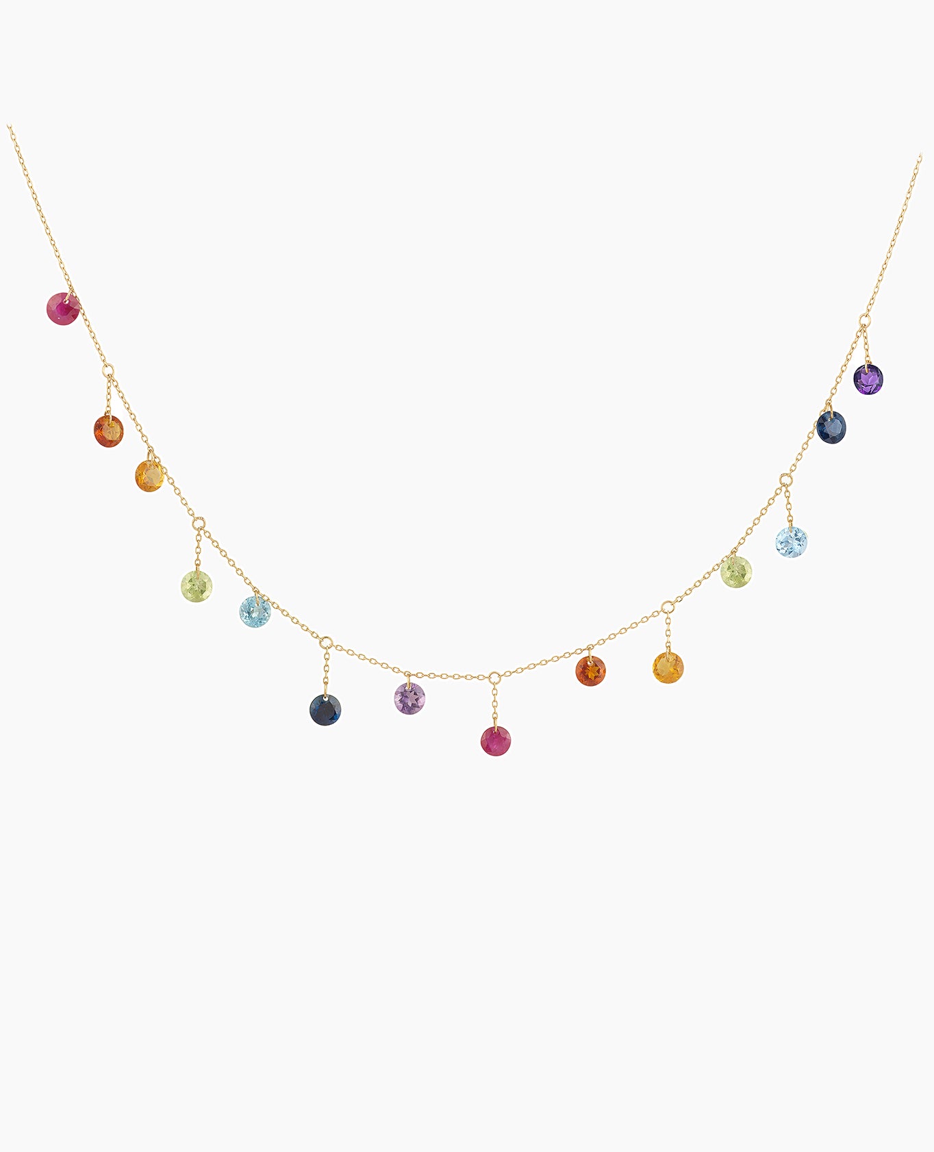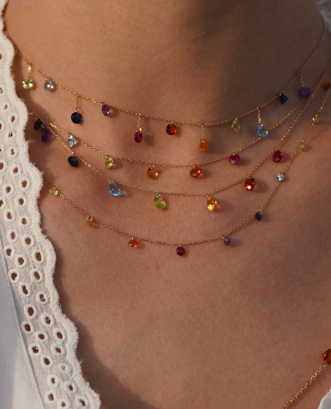 Collier Chakras or 18 carats et 13 pierres précieuses : Améthyste, Topaze, Rubis, Citrine, Péridot, Saphir et Citrine mandarine.