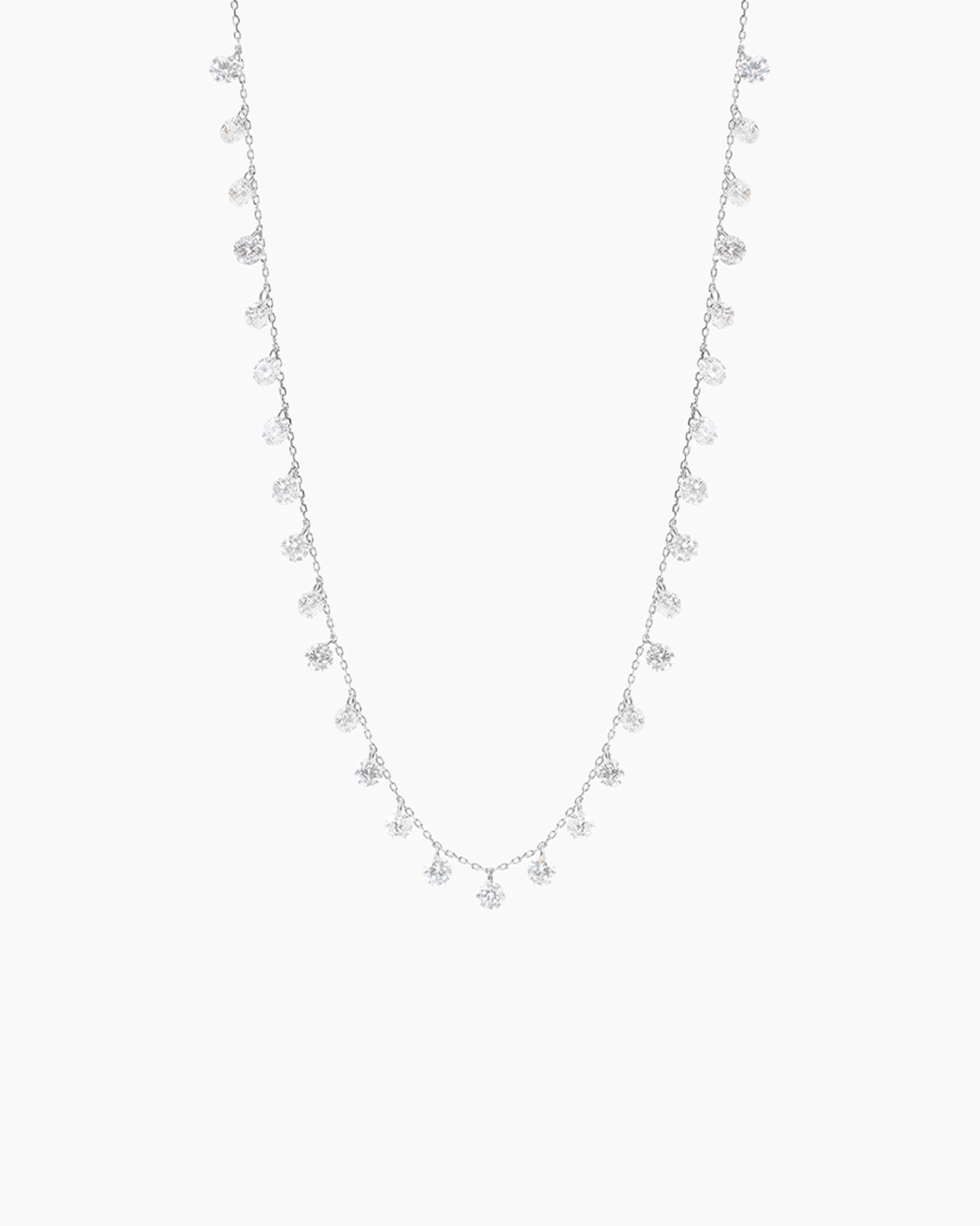 Très proches les uns des autres, les trente-et-un diamants suspendus qui ornent ce collier s’échangent leur reflet et leur éclat.