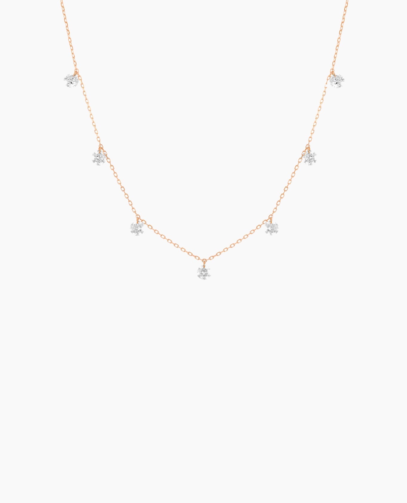 Les sept diamants percés de ce collier coulent sur la chaîne dorée à laquelle ils sont rattachés, partant de la nuque en descendant le long du cou. Leur éclat est visible de devant mais également sur les côtés. Sa taille est réglable grâce à une bille en silicone.