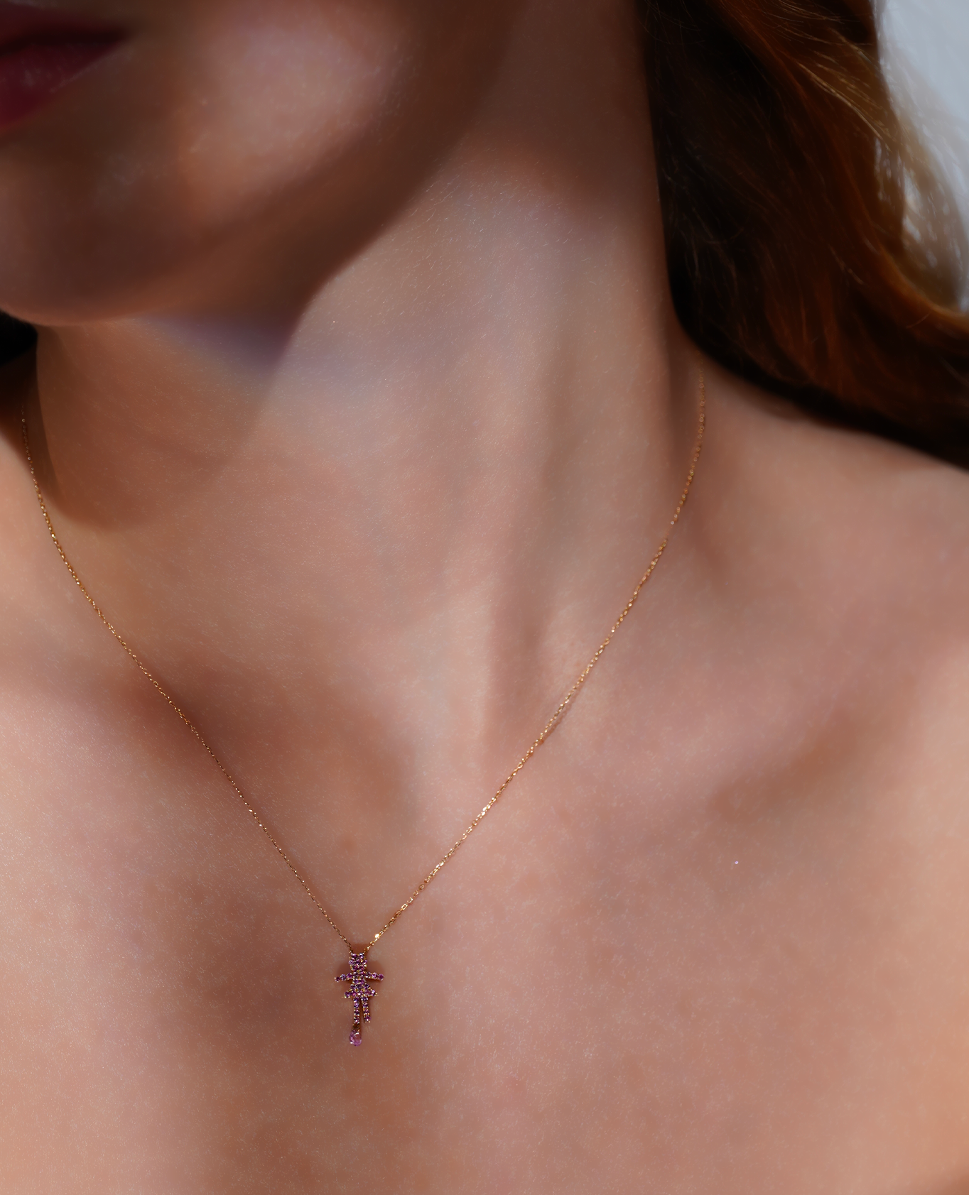Persée Paris présente son collier orné d'un symbole fille pavé de saphirs roses et orné d'un saphir rose suspendu, issu de la collection Séléné.