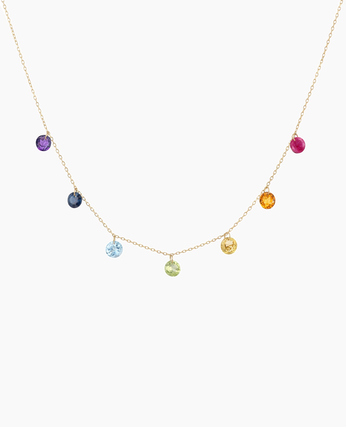 Collier Chakras or 18 carats et 7 pierres précieuses : Améthyste, Topaze, Rubis, Citrine, Péridot, Saphir et Citrine mandarine.