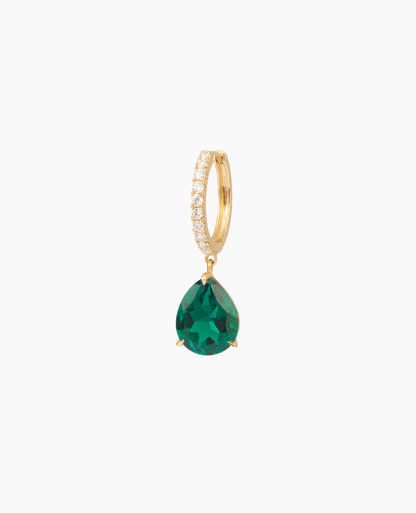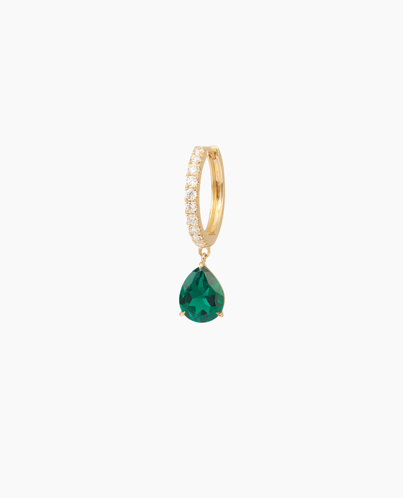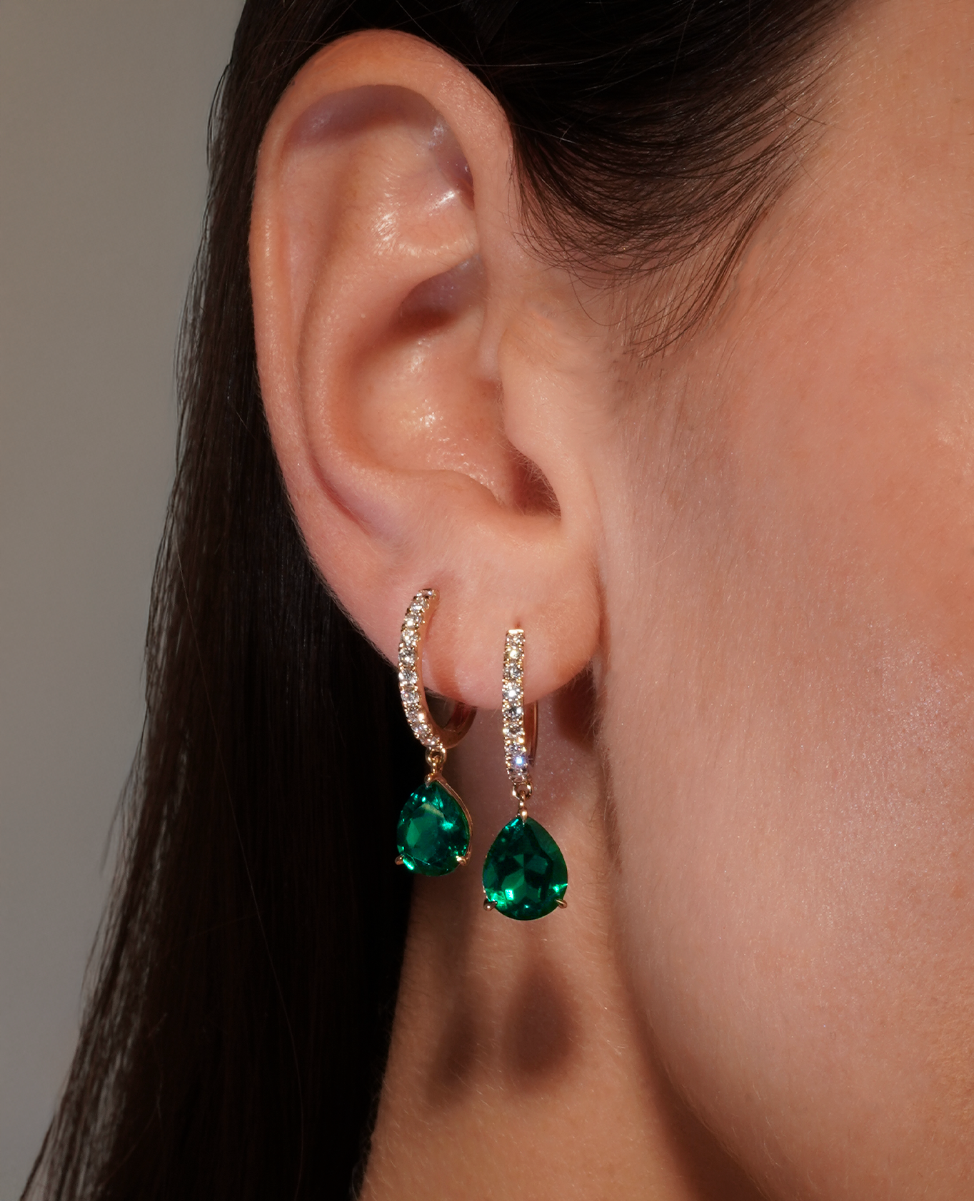 Chaque bijou, en forme de poire penchée, capture une goutte de lumière en mouvement.