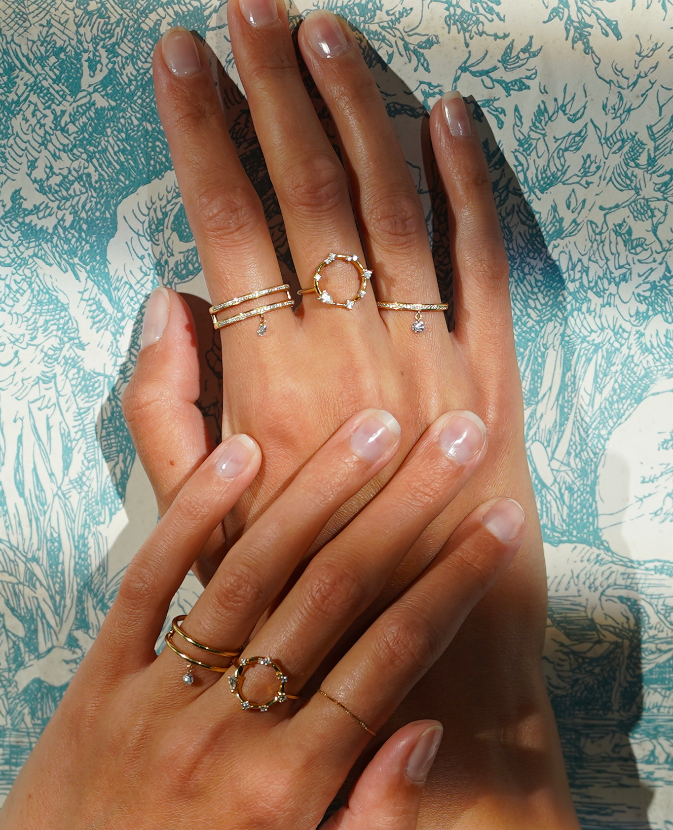 Avec son anneau d'or couvert de diamants, symbole de force et de délicatesse, et l'éclat de son diamant percé suspendu, la bague Zeus est une œuvre d'art qui se porte seule, ou mariée à d'autres.